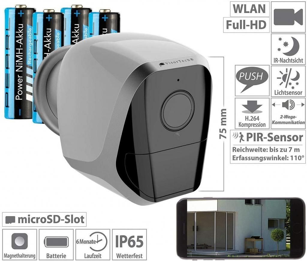 – VisorTech IPC-680 Akku IP HD Überwachungskamera mit App- Ihr kabelloser Wächter um Haus und Hof im Auge zu behalten- Bewegungserkennung für automatische Aufnahme dank 2 PIR-Bewegungs-Sensoren mit einstellbarer 3-Zonen-Überwachung- Speicherung der Full-HD-Video-Aufzeichnung auf einer Speicherkarte- In der Nacht: Überwachung dank Infrarot-Nachtsicht mit bis zu 5 m Reichweite- Weltweiter Fernzugriff & Push-Benachrichtigung per Gratis-App