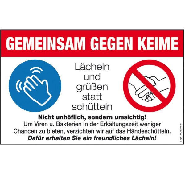 Warnschild – GEMEINSAM GEGEN KEIME – Gr. ca. 30 x 25 cm – 309169 309169 Hinweis-Schild – Warn-Schild Dieses hochwertige Schild aus Kunststoff ist vielseitig einsetzbar und wetterbeständig, kratzfest sowie UV-beständig. Das Schild ist im Außen- sowie Innenbereich einsetzbar. Materialstärke ca. 2 mm. … Mehr